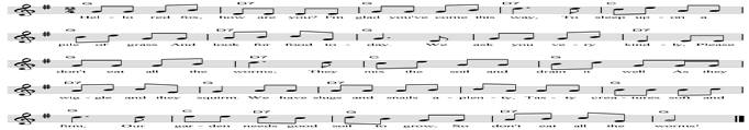 Hello red fox, how are you? We’re glad you’ve come this way, To sleep upon a pile of grass And look for food today. We ask you very kindly, Please don’t eat all the worms; They mix the soil and drain it well As they wiggle and they squirm. We have slugs and snails a-plenty, Tasty creatures soft and firm, Our garden needs good soil to grow, So don’t eat all the worms! |