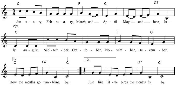 January, February, March, April, May, June, July, August, September, October, November, December, How the months go tumbling by. January, February, March, April, May, June, July, August, September, October, November, December, Just like little birds the months fly by. |