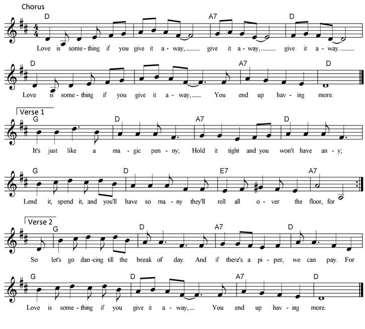 Chorus Love is something if you give it away, Give it away, give it away. Love is something if you give it away, You end up having more. It's just like a magic penny; Hold it tight and you won't have any; Lend it, spend it, and you'll have so many, They'll roll all over the floor.(for) Chorus So let's go dancing till the break of day. And if there's a piper, we can pay. For love is something if you give it away, You end up having more. (for) Chorus |