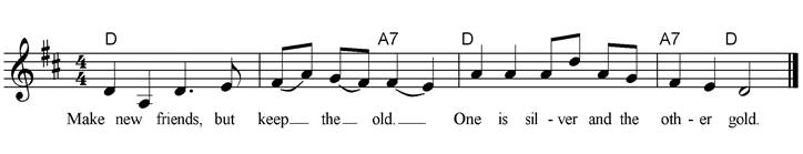 Make new friends, but keep the old. One is silver and the other gold. A circle is round, it has no end. That's how long, I will be your friend. A fire burns bright, it warms the heart. We've been friends, from the very start. You have one hand, I have the other. Put them together, we have each other. Silver is precious, gold is too. I am precious, and so are you. You help me, and I'll help you And together we will see it through. The sky is blue, the Earth is green, I can help to keep it clean. Across the land, across the sea, Friends forever we will always be. |