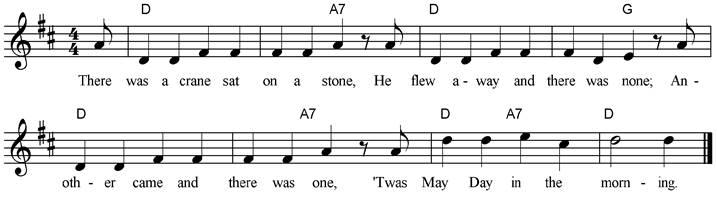 There was a crane sat on a stone, He flew away and there was none; Another came and there was one, ‘Twas May Day in the morning. There was a cat skinned up a tree, To see whatever was to see, When he fell down, then down fell he, ‘Twas May Day in the morning. There was a rooster in a trough, Who got a touch of whooping cough, He sneezed his tail and feathers off, ‘Twas May Day in the morning. There was a farmer made a wish, That he could swim like any fish, They popped him in a chafing dish, ‘Twas May Day in the morning. |