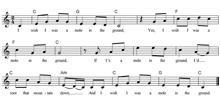 I wish I was a mole in the ground, Yes, I wish I was a mole in the ground, If I’s a mole in the ground, I'd root that mountain down, And I wish I was a mole in the ground. I wish I was a lizard in the spring. Yes, I wish I was a lizard in the spring, If I’s a lizard in the spring, I’d hear my darlin’ sing, And I wish I was a lizard in the spring. I wish I was a bird in the sky, Yes, I wish I was a bird in the sky, If I’s a bird in the sky, I’d spread my wings and fly, And I wish I was a bird in the sky. I wish I was a trout in the creek, Yes, I wish I was a trout in the creek, If I's a trout in the creek, Clear water I would seek, And I wish I was a trout in the creek. I wish I was a frog in the pond, Yes, I wish I was a frog in the pond, If I's a frog in the pond, I’d sing the whole night long, And I wish I was a frog in the pond. |