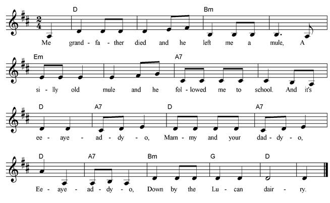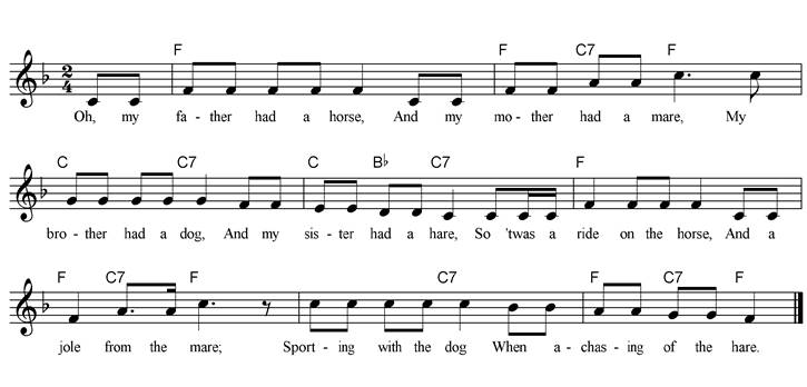 Oh, my father had a horse, And my mother had a mare, My brother had a dog, And my sister had a hare. So t’was a ride on the horse, And a jole from the mare; Sporting with the dog, When a-chasing of the hare. My father had an ox, And my mother had a cow, My brother had a pig, And my sister had a sow; We had beef from the ox, And milk from the cow, And bacon from the pig, And piglets from the sow. Refrain My father had a rooster, And my mother had a hen, My brother had a robin, And my sister had a wren; The rooster he did crow, And we had eggs from the hen, A song from the robin, And another from the wren. Refrain |