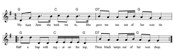 My Aunt Jane she took me in, She gave me tea out of her wee tin. Half a bap with sugar on the top, Three black lumps out of her wee shop. Half a bap with sugar on the top, Three black lumps out of her wee shop. My Aunt Jane she's awful smart, She bakes wee rings in an apple tart. And when Halloween comes round, For next that tart I'm always found. And when Halloween comes round, For next that tart I'm always found. My Aunt Jane has a bell on the door, A white stone step and a clean swept floor. Candy apples, hard green pears, Conversation lozenges. Candy apples, hard green pears, Conversation lozenges. My Aunt Jane she can dance a jig, Sing a song ‘round a sweetie pig. Wee red eyes and a cord for a tail, Hanging in a bunch from a crooked nail. Wee red eyes and a cord for a tail, Hanging in a bunch from a crooked nail. My Aunt Jane she never cross, She paid five shillings for an old wooden horse. She jumped on its back, the bones let a crack, You’ll play the fiddle till I get back. She jumped on its back the bones let a crack, You’ll play the fiddle till I get back. My Aunt Jane she took me in, She gave me tea out of her wee tin. Half a bap, a wee sugar top, Three black lumps out of her wee shop. Half a bap, a wee sugar top, Three black lumps out of her wee shop. |