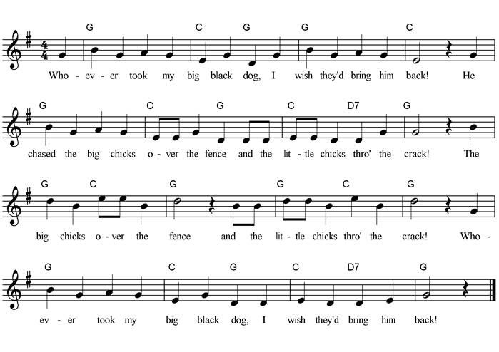 Whoever took my big black dog, I wish they bring him back! He chased the big chicks over the fence And the little chicks through the crack! The big chicks over the fence And the little chicks through the crack! Whoever took my big black dog, I wish they'd bring him back! |