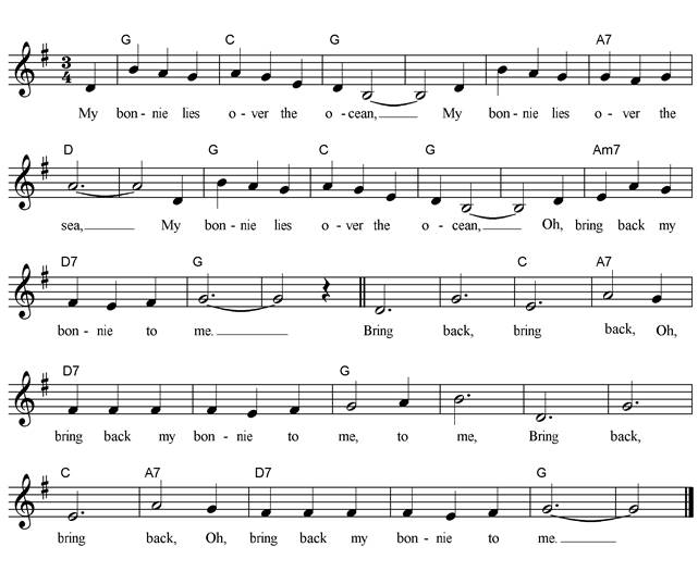 My bonnie lies over the ocean, My bonnie lies over the sea, My bonnie lies over the ocean, Oh, bring back my bonnie to me. Chorus Bring back, bring back, Oh, bring back my bonnie to me, to me, Bring back, bring back, Bring back my bonnie to me. Last night as I lay on my pillow, Last night as I lay on my bed, Last night as I lay on my pillow, I dreamt that my bonnie was dead. Chorus Oh blow ye winds over the ocean, Oh blow ye winds over the sea, Oh blow ye winds over the ocean, And bring back my bonnie to me. Chorus The winds have blown over the ocean, The winds have blown over the sea, The winds have blown over the ocean, And brought back my bonnie to me. Chorus |