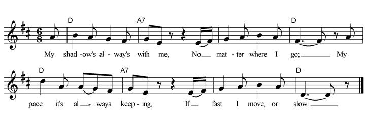 My shadow’s always with me No matter where I go. My pace it’s always keeping; If I move fast or slow. It’s size it’s always changing, Sometimes it shoots up tall; And then again it dwindles Until it’s very small. But though it’s very friendly, And loves with me to stay, My funny little shadow Has not a word to say. |