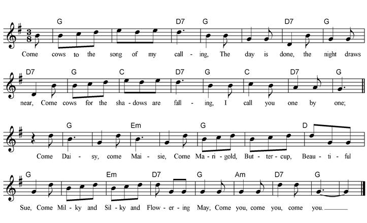 Come cows to the song of my calling, The day is done, the night draws near, Come cows for the shadows are falling, I call you one by one; Come Daisy, come Maisie, Come Marigold, Buttercup, Beautiful Sue, Come Milky and Silky and Flowering May, Come you, come you, come you. |
