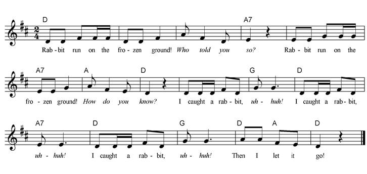 Rabbit run on the frozen ground! Who told you so? Rabbit run on the frozen ground! How do you know? I caught a rabbit, uh-huh! I caught a rabbit, uh-huh! I caught a rabbit, uh-huh! Then I let it go! Foxy run on the frozen ground! Who told you so? Foxy run on the frozen ground! How do you know? I caught a fox, uh-huh! I caught a fox, uh-huh! I caught a fox, uh-huh! Then I let it go! Bear run on the frozen ground! Who told you so? Bear run on the frozen ground! How do you know? I caught a bear, uh-huh! I caught a bear, uh-huh! I caught a bear, uh-huh! Then I let it go! |