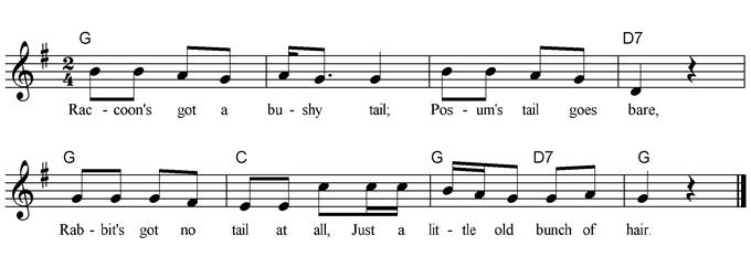 Racoon’s got a bushy tail, Possum’s tail goes bare, Rabbit’s got no tail at all Just a little old bunch of hair. Raccoon is a mighty man, He rambles through the dark, You ought to see him hunt his den When he hears old Rover bark. Possum up the persimmon tree, Raccoon on the ground, Raccoon says to possum, "Won't you shake them simmons down?” Rabbit’s on the pine tree stump, Raccoon in the hollow, Possum in the potato patch, As plump as he can wallow. Racoon’s got a bushy tail, Possum’s tail goes bare, Rabbit’s got no tail at all Just a little old bunch of hair. |