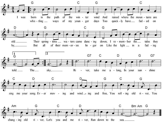 I was born in the path of the winter wind And raised where the mountains are old. Their springtime waters came dancing down; I remember the tales they told. The whistling ways of my younger days Too quickly have faded on by. But all of their memories linger on Like the light in a fading sky. Chorus: River, take me along; In your sunshine, sing me your song. Ever moving and winding and free, You rolling old river, you changing old