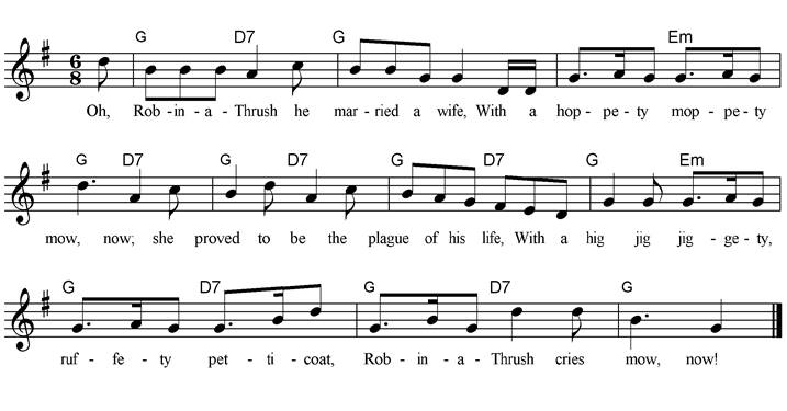Oh, Robin-a-Thrush, he married a wife, With a hoppety, moppety, mow, now; She proved to be the plague of his life, With a hig jig jiggety, ruffety petticoat, Robin-a-Thrush cries mow, now! Her cheese when made was put on the shelf, With a hoppety, moppety, mow, now; And it never was turned till it turned of itself; With a hig jig jiggety, ruffety petticoat. Robin-a-Thrush cries mow, now! It turned and turned 'til it walked on the floor, With a hoppety, moppety, mow, now; It stood upon legs and walked out the door; With a hig jig jiggety, ruffety petticoat. Robin-a-Thrush cries mow, now! It walked 'til it came to Banbury Fair, With a hoppety, moppety, mow, now; The dame followed after upon a grey mare; With a hig jig jiggety, ruffety petticoat. Robin-a-Thrush cries mow, now! This song, it was made for gentlemen, With a hoppety, moppety, mow, now; If you want any more, you must sing it again; With a hig jig jiggety, ruffety petticoat. Robin-a-Thrush cries mow, now! |