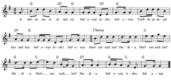 away, ladies. Sail away. Chorus: Don’t you rock 'em? Die-di-o, Don’t you rock 'em? Die-di-o, Don’t you rock 'em? Die-di-o, Sail away ladies. Sail away. I got a home in Tennessee. Sail away... That's the place I wanna be. Sail away... If I ever get my way, Sail away... Tennessee is where I'll stay. Sail away... Chorus If ever I get my new house done. Sail away... I’ll give my old one to my son. Sail away... If ever I finish this porch and stairs, Sail away... I’ll lie around in my rockin' chair. Sail away... Chorus Hush, little baby, don't you cry. Sail away... We’ll all be angels by and by. Sail away... Never mind what your daddy say. Sail away... Shake your little foot and fly away. Sail away... Chorus |