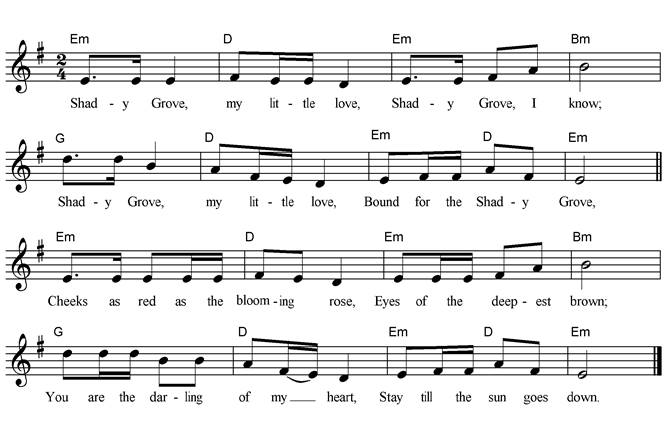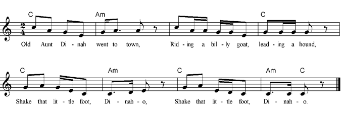 Old Aunt Dinah went to town Riding a billy goat, leading a hound, Shake that little foot, Dinah-o, Shake that little foot, Dinah-o. Hound dog barked, billy goat jumped, Set Aunt Dinah straddle of a stump, Shake that little foot, Dinah-o, Shake that little foot, Dinah-o. Sift the meal and save the bran; Give it to the old cow to make her stand, Shake that little foot, Dinah-o, Shake that little foot, Dinah-o. Old Aunt Dinah, sick in bed, Sent for the doctor, doctor said, Shake that little foot, Dinah-o, Shake that little foot, Dinah-o. Get up Dinah, you ain’t sick, All you need is a hickory stick, Shake that little foot, Dinah-o, Shake that little foot, Dinah-o. |