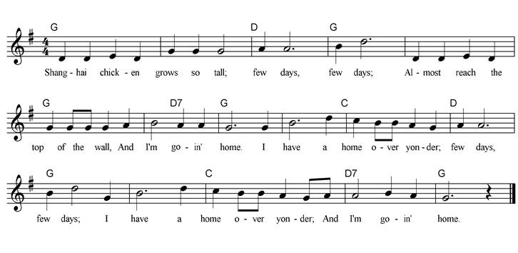 Shanghai chicken grows so tall, few days, few days; Almost reach the top of the wall and I’m goin’ home. I have a home over yonder, few days, few days. I have a home over yonder and I’m goin’ home. Shanghai chicken grows so tall, few days, few days. Take that egg a month to fall, and I’m goin’ home. Great big fish they call a whale, few days, few days. Swallowed Jonah head and tail, and I’m goin’ home. |