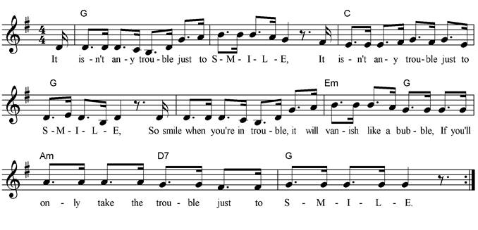 It isn't any trouble just to S-M-I-L-E, It isn't any trouble just to S-M-I-L-E, So smile when you're in trouble, It will vanish like a bubble, If you'll only take the trouble just to S-M-I-L-E! It isn't any trouble just to G-i-gig-gle-ee, It isn't any trouble just to G-i-gig-gle-ee, So giggle when you're in trouble, It will vanish like a bubble, If you'll only take the trouble just to G-i-gig-gle-ee! It isn't any trouble just to Ha ha ha ha, laugh, It isn't any trouble just to Ha ha ha ha, laugh, So laugh when you're in trouble, It will vanish like a bubble, If you'll only take the trouble just to Ha ha ha ha, laugh! |