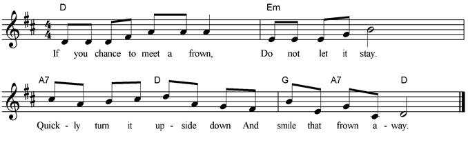 If you chance to meet a frown, Do not let it stay. Quickly turn it upside down And smile that frown away. No one likes a frowning face. Change it for a smile. Make the world a better place By smiling all the while. |