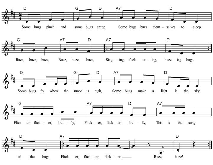 Some bugs pinch and some bugs creep, Some bugs buzz themselves to sleep. Buzz, buzz, buzz, Buzz, buzz, buzz, Singing, flickering, buzzing bugs. X2 Some bugs fly when the moon is high. Some bugs make a light in the sky. Flicker, flicker firefly, Flicker, flicker firefly, This is the song of the bugs. Flicker, flicker, flicker, Buzz, buzz! X2 |