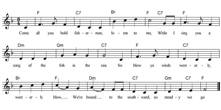 Come all you bold fishermen, listen to me, While I sing you a song of the fish in the sea. Chorus So blow ye winds westerly, westerly blow, We're bound to the southward, so steady we go. First comes the blue-fish a-wagging his tail, He come up on the deck and yells: "All hands make sail!" Next come the eels, with their nimble tails, They jumped up aloft and loose all the sails. Then comes the swordfish, the scourge of the sea, The order he gives is "Helm's a-lee!" Next comes the whale, the largest of all, Singing out from the bridge: "Haul taut, mainsail, haul!" Then comes the mackerel, with his striped back, He flops on the bridge and yells: "Board the main tack!" Along came a dolphin, a-flapping his tail, He yells to the boatswain to reef the foresail. Along came the shark, with his three rows of teeth, He flops on the foreyard and takes a snug reef. Up jumps the fisherman, stalwart and grim, And with his big net he scoops them all in. I'll go back to bed and I'll lie there all day, If there's nothing for to eat then there’s nothing to pay. |