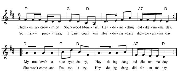 Chickens a-crowin' on Sourwood Mountain, Hey-de-ing-dang, diddle-umma-day. So many pretty girls I can't count 'em, Hey-de-ing-dang, diddle-umma-day. My true love's a blue-eyed daisy, Hey-de-ing-dang, diddle-umma-day. She won't come and I'm too lazy. Hey-de-ing-dang, diddle-umma-day. Big dog bark, little one bite you, Hey-de-ing-dang, diddle-umma-day. Big girl court, little one like you. Hey-de-ing-dang, diddle-umma-day. My true love lives over the river, Hey-de-ing-dang, diddle-umma-day. A few more jumps and I'll be with her. Hey-de-ing-dang, diddle-umma-day.