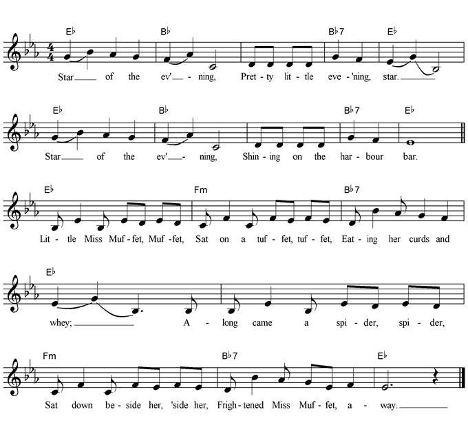 Chorus Star of the evening, pretty little evening star, Star of the evening, shining on the harbour bar. Little Miss Muffet, Muffet, Sat on her tuffet, tuffet, Eating her curds and whey; Down came a spider, spider, Sat down beside her, ‘side her, And frightened Miss Muffet away. Little Jack Horner, Horner, Sat in a corner, corner, Eating his Christmas pie; He put in his thumb, his thumb, And pulled out a plum, a plum, And said what a good boy am I. Old Mother Hubbard, Hubbard, Went to her cupboard, cupboard, To fetch her poor doggy a bone; But when she got there, got there, The cupboard was bare, was bare, And so the poor little doggy had none. |