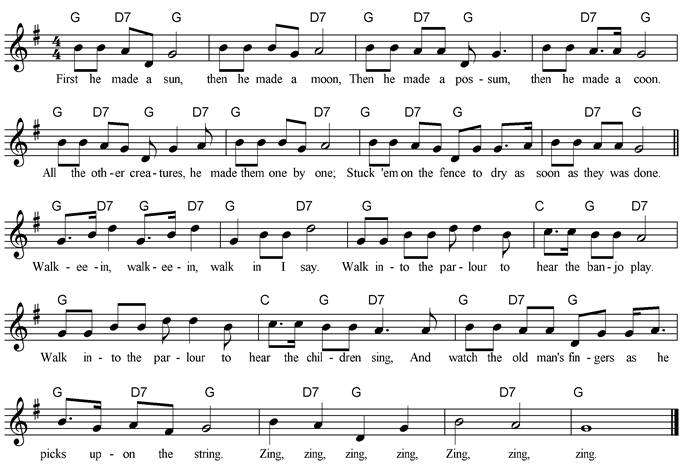 they was done. Chorus Walk-ee-in, walk-ee-in, walk in, I say. Walk into the parlour to hear the banjo