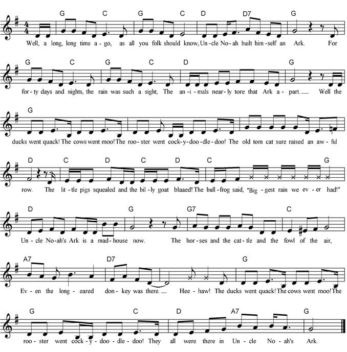 The ducks went quack! The cows went moo! The rooster went cocky-doodle-doo! They all were there on Uncle Noah's ark. Well, at last the sun did shine, Through the windows bright and fine, Uncle Noah thought it was time to land. Well, he couldn't get open the door, All the animals they got sore, The old lion let out a roar to