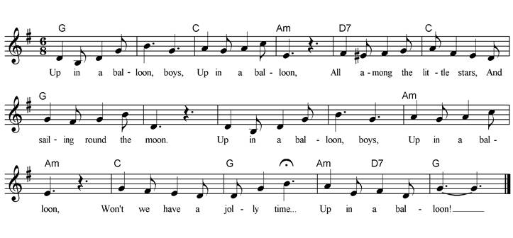 Up in a balloon, boys, Up in a balloon, All among the little stars And sailing ‘round the moon. Up in a balloon, boys, Up in a balloon. Won’t we have a jolly time, Up in a balloon! |