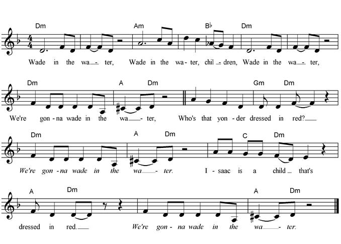 Chorus: Wade in the water, Wade in the water, children, Wade in the water, We’re gonna wade in the water. Who’s that yonder dressed in red? We’re gonna wade in the water. Isaac is a child that’s dressed in red. We’re gonna wade in the water. Chorus Who’s that yonder dressed in blue? We’re gonna wade in the water. Emilia is a child that’s dressed in blue. We’re gonna wade in the water. Chorus |