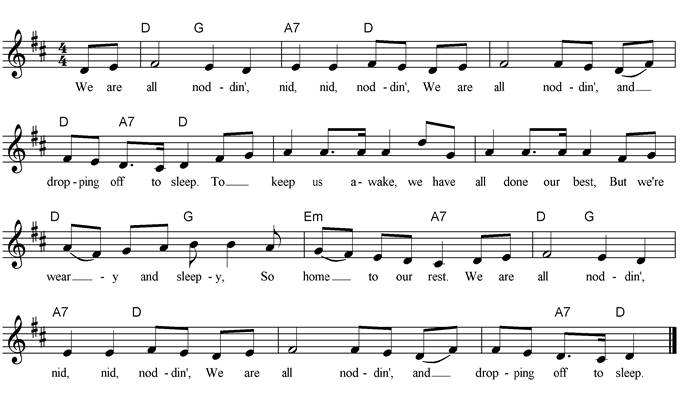 sleep. To keep us awake we have all done our best, But we're weary and sleepy, So home to our rest, For we're all noddin’, nid, nid, noddin’, We are all noddin’, and dropping off to