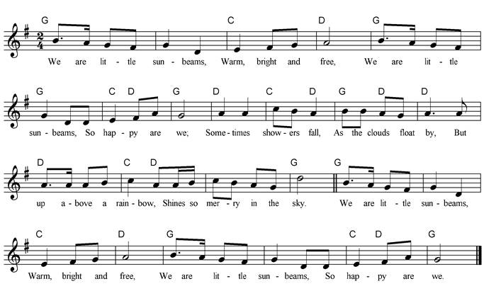 We are little sunbeams, Warm bright and free, We are little sunbeams, So happy are we; Sometimes showers fall, As the clouds go by, But up above a rainbow, Shines so merry in the sky. Chorus We are little sunbeams, Warm bright and free, We are little sunbeams, So happy are we. We are little sunbeams, Like those above, We are little sunbeams, Warming with love; For mother, father, family And friends in every way, For our our world, the gifts we have, We give our thanks each day. Chorus We are little sunbeams, With work to do, We are little sunbeams, May we be true. Where others lead the way, With footsteps sure, There we may rest and stay, Safe and secure. Chorus |