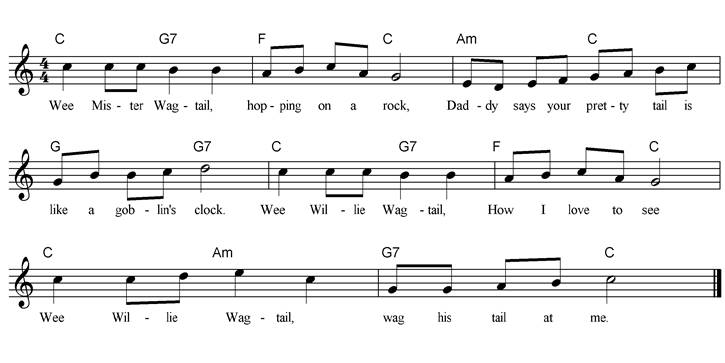 Wee Mister Wagtail, hopping on a rock, Daddy says your pretty tail is like a