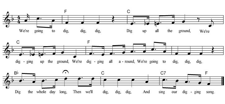 dig, dig, Dig up all the ground, We're digging up the ground, We're digging all a-round, We're going to dig,