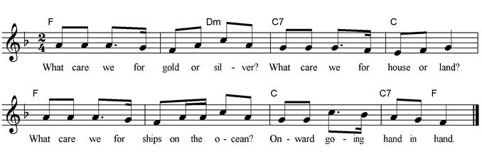 or silver? What care we for house or land? What care we for ships on the ocean? Onward going hand in hand. |