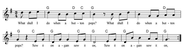 What shall I do when a button pops? What shall I do when a button pops? Sew it on again sew it on, Sew it on again sew it on. What shall I do when my pencil breaks? X2 Grind it sharp again, grind it sharp… What shall I do when an apple falls? X2 Eat it up quite quick, eat it up… What shall I do at the close of day? What shall I do at the close of day? Go to bed and sleep, go to bed, Go to bed and sleep, go to bed. |