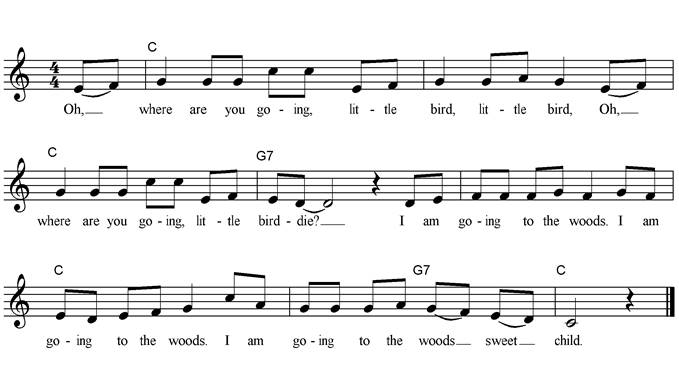 little bird? Oh, where are you going, little birdie? I am going to the woods, I am going to the woods, I am going to the woods, sweet child. Oh, what's in the woods, little bird,