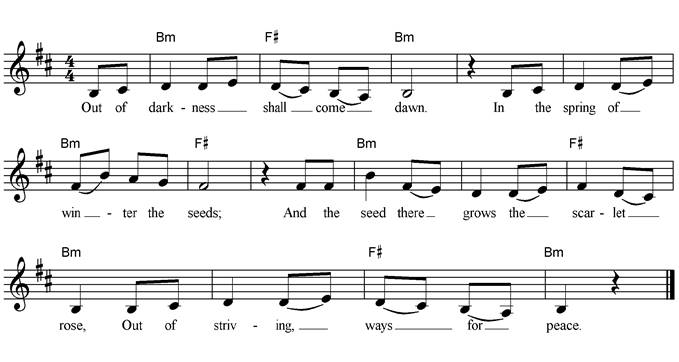 Out of darkness shall come dawn, In the spring of winter the seeds, And the seed there grows the scarlet rose, Out of striving, ways for peace. |