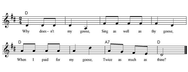 Why doesn't my goose, Sing as much as thy goose, When I paid for my goose, Twice as much as thine? Why doesn't my goose, Lay as much as thy goose, When I paid for my goose, Twice as much as thine? Why doesn't my goose, Fly as much as thy goose, When I paid for my goose, Twice as much as thine? |