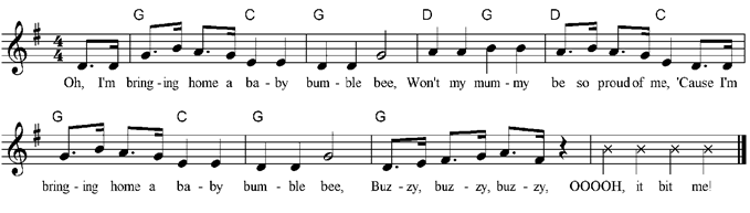 baby bumble bee, Buzzy, buzzy, buzzy, Spoken: OOOOH, it bit me! Oh, I'm bringing home a baby
