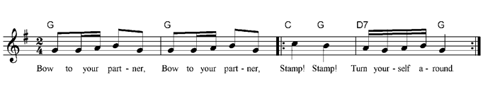 Bow to your partner! Bow to your partner! Stamp! Stamp! Turn yourself around! Clap with your partner! Clap with your partner! Jump! Jump! Turn yourself around! Shake hands with your partner! Shake hands with your partner! Hop! Hop! Turn yourself around! |