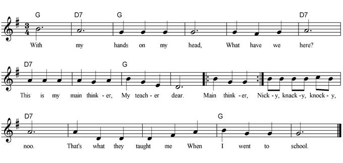 Mama don't allow no yellin' and shoutin' 'round here, Mama don't allow no yellin' and shoutin' 'round here, Well, we don't care what mama don't allow, Gonna yell and shout just any old how, Mama don't allow no yellin' and shoutin' 'round here. Mama don't allow no bed jumpin' 'round here, Mama don't allow no bed jumpin' 'round here, Well, we don't care what mama don't allow, Gonna jump on the bed just any old how, Mama don't allow no bed jumpin' 'round here. Mama don't allow no stompin' in puddles 'round here, Mama don't allow no stompin' in puddles 'round here, Well, we don't care what mama don't allow, Gonna stomp in the puddles just any old how, Mama don't allow no stompin' in puddles 'round here. Mama don't allow no pillow fightin' 'round here, Mama don't allow no pillow fightin' 'round here, Well, we don't care what mama don't allow, Gonna fight with the pillows just any old how, Mama don't allow no pillow fightin' 'round here. Mama don't allow no guitar playin’ 'round here, Mama don't allow no guitar playin’ 'round here, Well, we don't care what mama don't allow, Gonna play my guitar just any old how, Mama don't allow no guitar playin’ 'round here. |