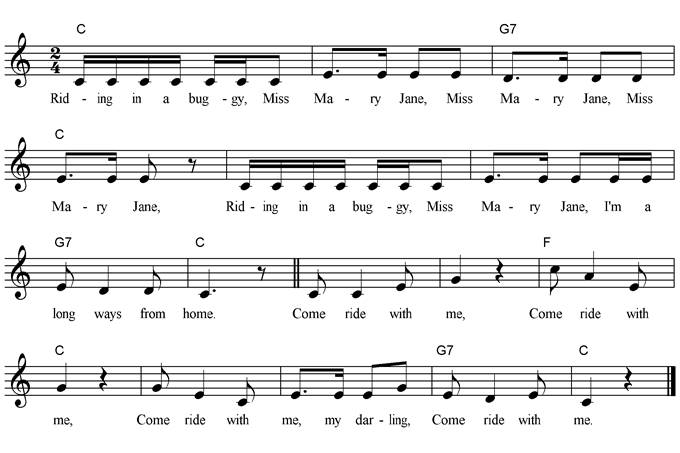 Riding in a buggy, Miss Mary Jane, Miss Mary Jane, Miss Mary Jane, Riding in a buggy, Miss Mary Jane, I’m a long ways from home. Come ride with me, Come ride with me, Come ride with me, my darling, Come ride with me. Riding in a boat, Miss Mary Jane, Miss Mary Jane, Miss Mary Jane, Riding in a boat, Miss Mary Jane, I’m a long ways from home. Come row with me.... Flying in a plane, Miss Mary Jane, Miss Mary Jane, Miss Mary Jane, Flying in a plane, Miss Mary Jane, I’m a long ways from home. Come fly with me.... Riding in a train, Miss Mary Jane, Miss Mary Jane, Miss Mary Jane, Riding in a train, Miss Mary Jane, I’m a long ways from home. Come ride with me.... Come sit with me.... |