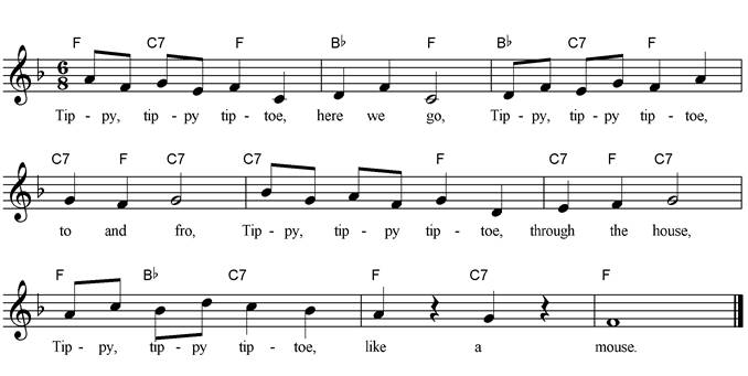 Tippy, tippy, tiptoe, here we go, Tippy, tippy, tiptoe, to and fro. Tippy, tippy, tiptoe, through the house, Tippy, tippy, tiptoe like a mouse. Tippy, tippy, tiptoe, here we go, Tippy, tippy, tiptoe, to and fro. Tippy, tippy, tiptoe, time to hop, Tippy, tippy, tiptoe, time to stop. |