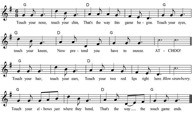 your nose, touch your chin, That’s the way this game begins. Touch your eyes, touch your knees, Now pretend you have to sneeze. ATCHOO! Touch your hair, touch your ears, Touch your two red lips right here. Blow