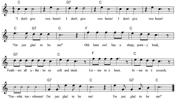 I don’t give two hoots, I don’t give two hoots, I don’t give two hoots, I’m just glad to be me. Old barn owl has a sharp, pointy beak, Feathers all a-flutter, so soft and sleek. Listen to it hoot, listen to it screech, “Too-whit, too-whoooo! I’m just glad to be me. I’m just glad to be me.” Chorus Elephant’s trunk is useful and strong, Its ears wiggle waggle, it stomps along, Listen to that trump! Such a playful song! “Trumpetty trump! I’m just glad to be me. I’m just glad to be me.” Chorus Little mouse has a pink, twitchy nose, It scampers and scrabbles on its tiny toes, Listen to it squeak where ever it goes, “Eek! Eek! Eek! Eek! I’m just glad to be me. I’m just glad to be me.” Chorus |