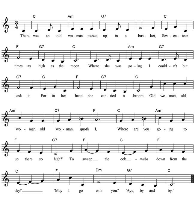There was an old woman tossed up in a basket, Seventeen times as high as the moon. Where she was going, I couldn’t but ask it, For in her hand she carried a broom. ‘Old woman, old woman, old woman,’ quoth I, ‘Where are you going to up there so high?’ ‘To sweep the cobwebs down from the sky!’ ‘May I go with you?’ ‘Aye, by and by.’ |