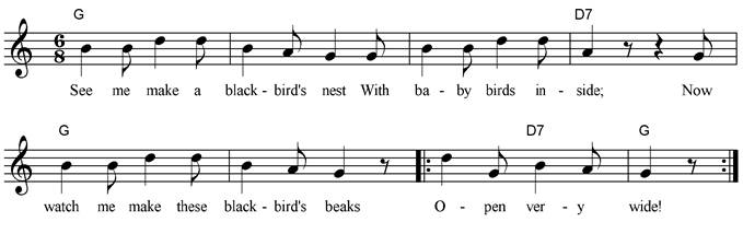 See me make a blackbird’s nest With baby birds inside; Now watch me make these blackbird beaks Open very wide! x2 Mother bird and father bird Take turns to watch their brood; The other then flies off to find Wiggly worms for food! x2 Mmmmmh! |