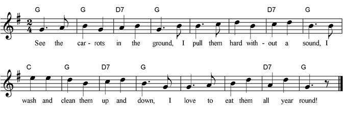 See the carrots in the ground, I pull them hard without a sound, I wash and clean them up and down, I love to eat them all year round! |