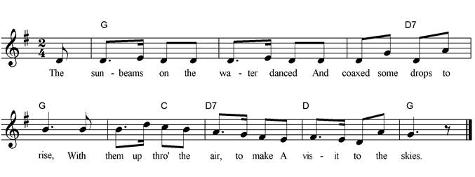 The sunbeams on the water danced And coaxed some drops to rise, With them up thro' the air, to make A visit to the skies. Then far and far above the earth In clouds of white and grey, Across the sky the water drops Went wand'ring in their play. The wondrous visit at an end, They hurried down again; And as they came the children all Cried out, "Oh! see the rain!" |