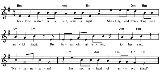 Tortoise walked in the field, what a sight, Shaking and trembling with awful fright; But listen, oh, just listen, to her sing, “Na-na-na-na-na! I’m not afraid of any old thing! I’m not afraid of any old thing!” |